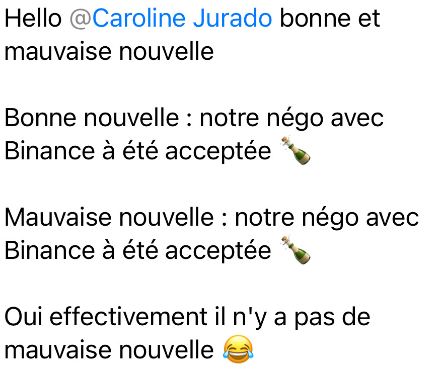 J’avais quand même une idée en tête, convaincre l’Exchange numéro 1 dans le monde de bosser avec moi : Binance.